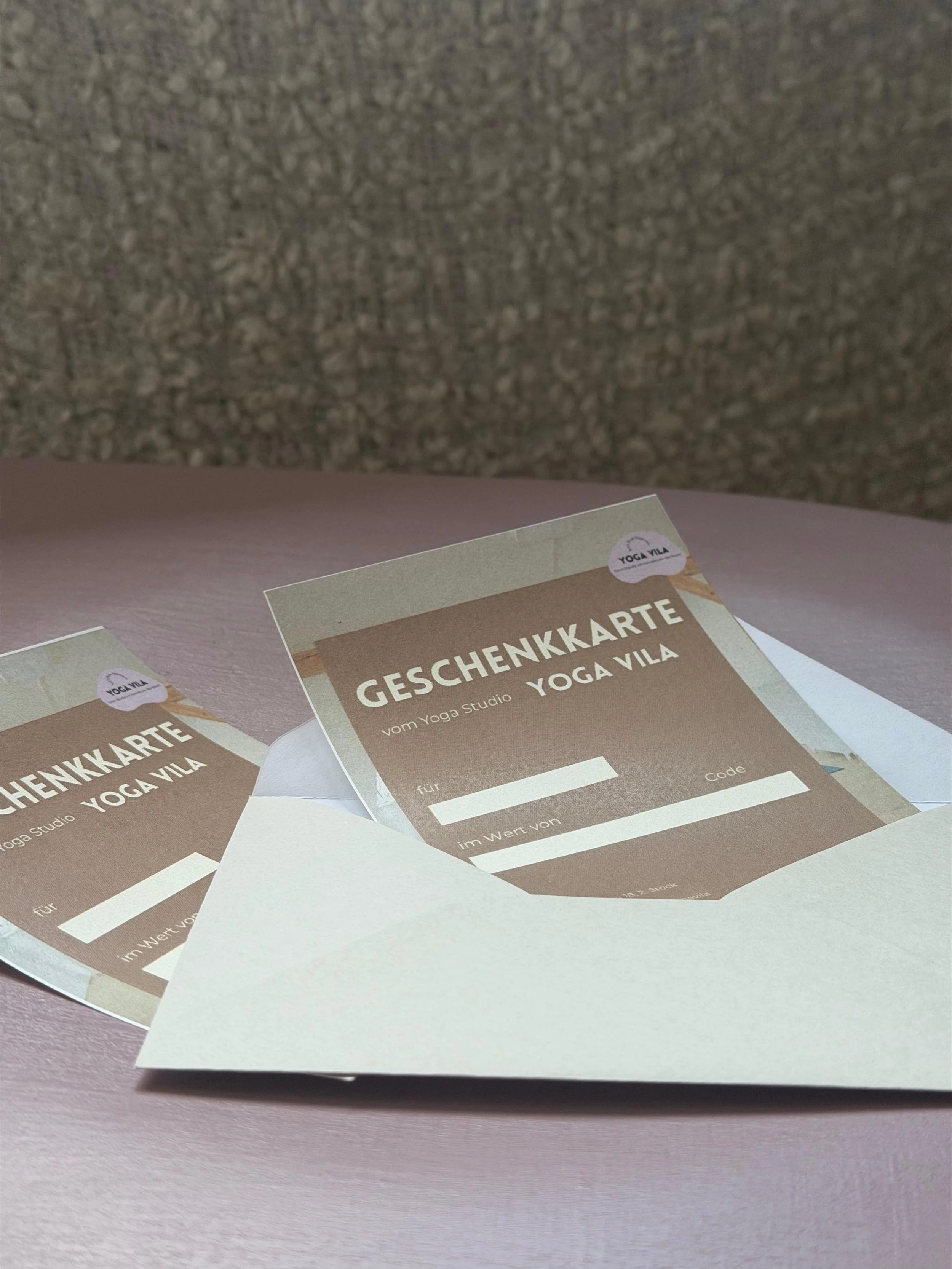 Unsere Yoga-Gutscheine sind das perfekte Geschenk. Wunschbetrag auswählen, online kaufen und sofort erhalten – einlösbar für Yoga-Stunden, Events oder Produkte aus unserem Shop.